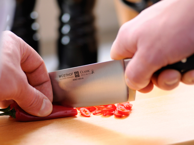 Avvertenza: I coltelli da chef sono intenzionalmente sottili per massimizzare le prestazioni di taglio. Tagliare attraverso le ossa può scheggiare il filo sottile.