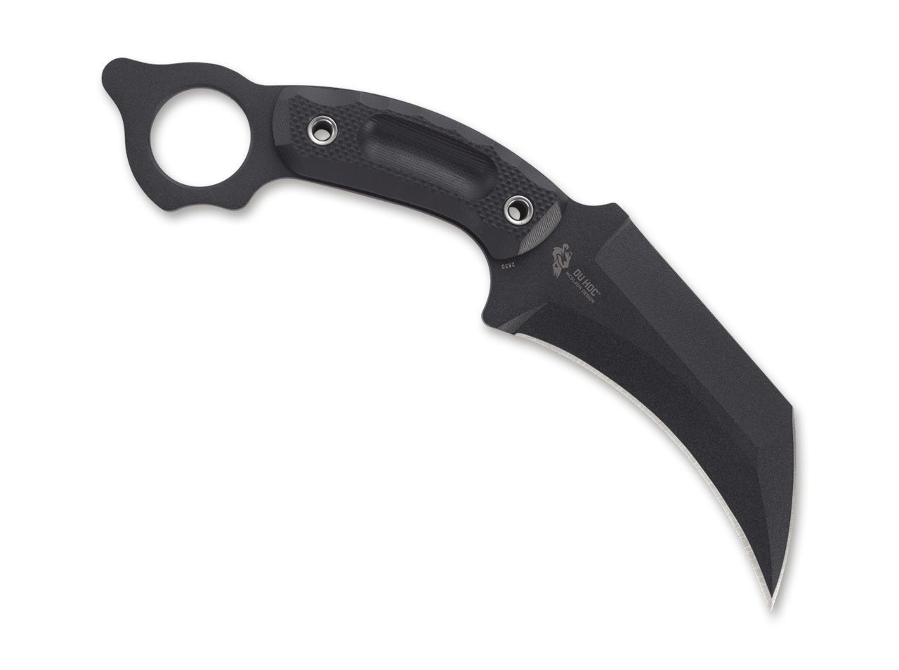 Un Karambit funzionale e robusto, perfezionato dal punto della sua lama curva fino all'anello sul manico. La lama rivestita è realizzata in acciaio al carbonio SK5 di alta qualità, ha una punta affilata su entrambi i lati e offre una stabilità eccezionale. L'alto contenuto di manganese conferisce una durezza eccezionale e un'ottima tenuta del filo. Le robuste guancette in G10 hanno una struttura fine e offrono una presa sicura anche in condizioni meteorologiche avverse. Il fodero GRP aderente può essere fissato alla cintura o all'attrezzatura tramite l'adattatore incluso.