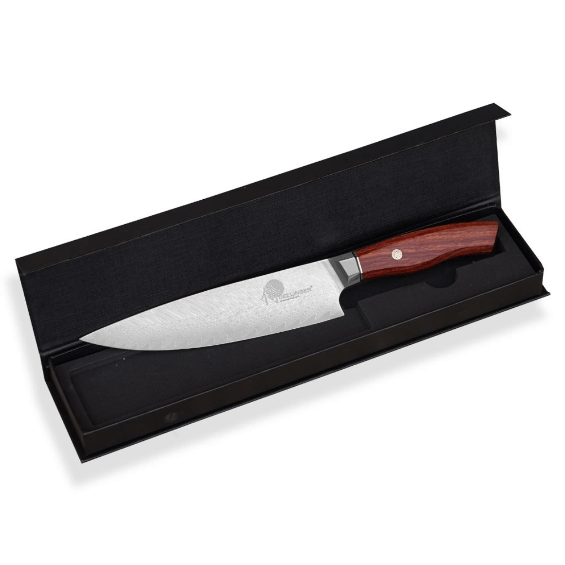 Il coltello da chef Gyuto/Chef DELLINGER TOIVO Professional Damascus K-H64 è ideale per un uso versatile, perfetto per affettare, pulire carne, frutta e verdura. È adatto anche per tritare erbe, verdure e noci grazie alla sua parte superiore più alta.