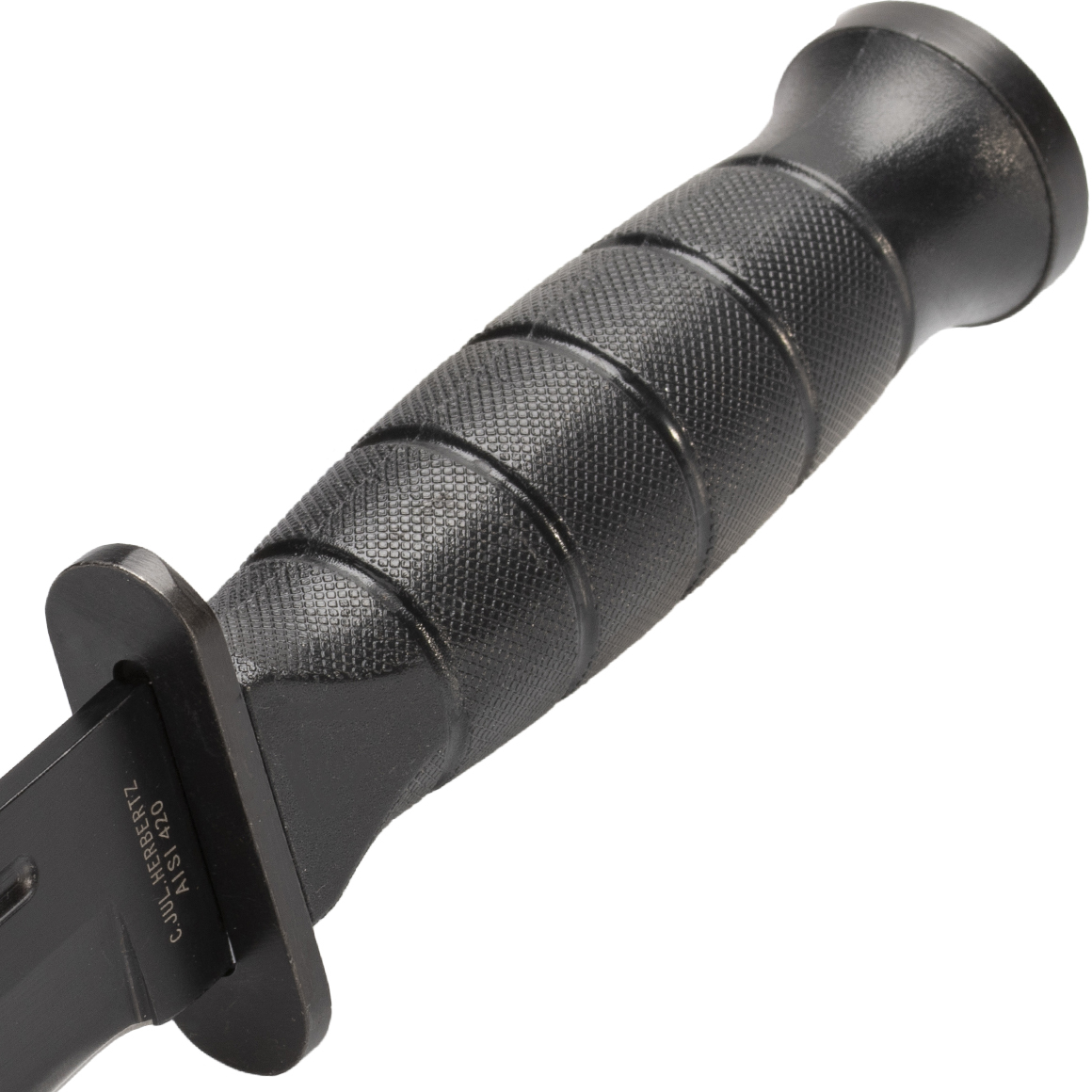 Il modello Herbertz offre un coltello robusto e versatile. La lama fissa di 15 cm è realizzata in acciaio inossidabile AISI 420. L'impugnatura in plastica nera è comoda da tenere. La confezione include un fodero in pelle nera con passante per cintura.