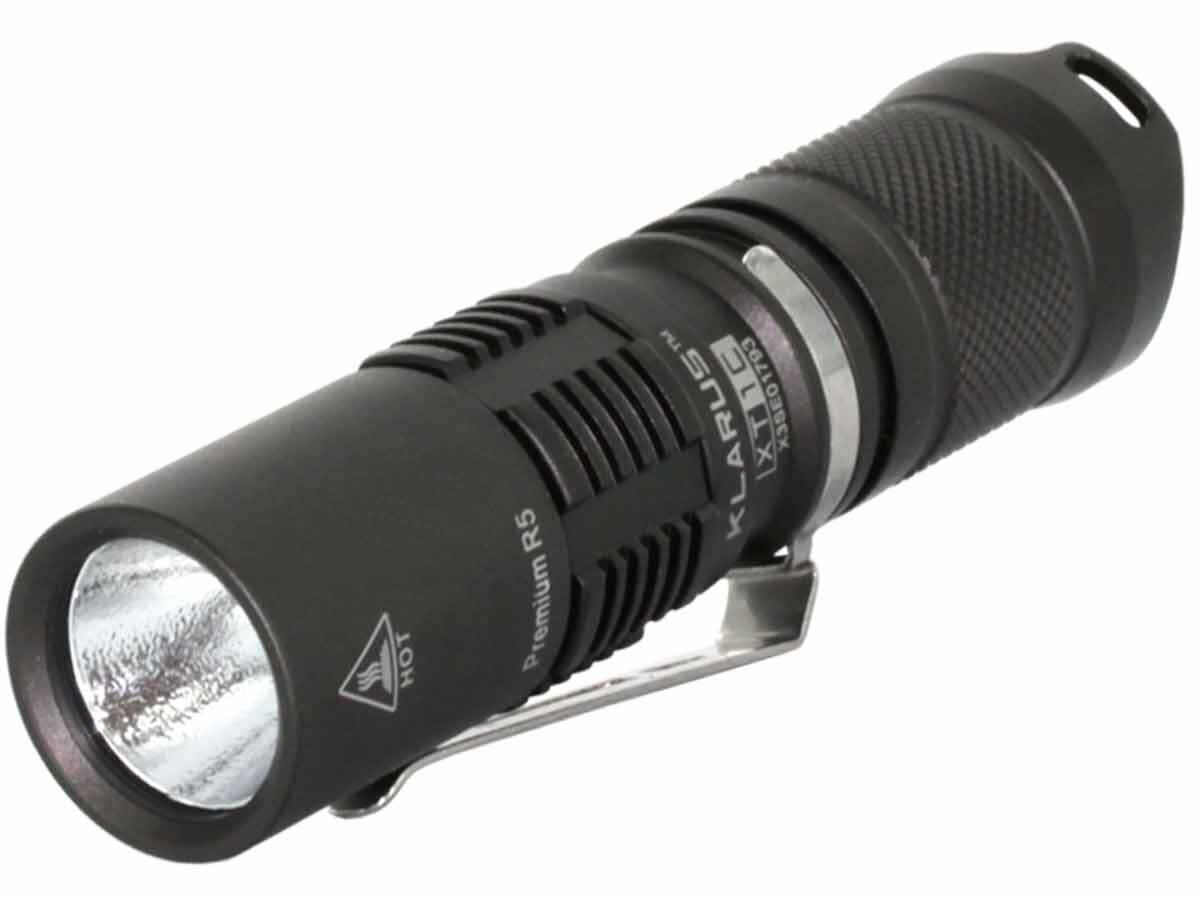 Potente torcia LED nera Klarus XT1C, alimentata da una singola batteria Li-ion 16340 3,7 V, con un'uscita LED di 700 lumen. Dispone di modalità tattica e outdoor, 3 modalità di illuminazione + 2 modalità lampeggianti. Ha un doppio interruttore tattico alla fine della torcia (tondo per accendere/spegnere e allungato per cambiare modalità di illuminazione). La torcia ha un corpo in lega di alluminio aeronautico. È utilizzata dalle forze armate, ma può essere utilizzata anche per escursioni o campeggio.