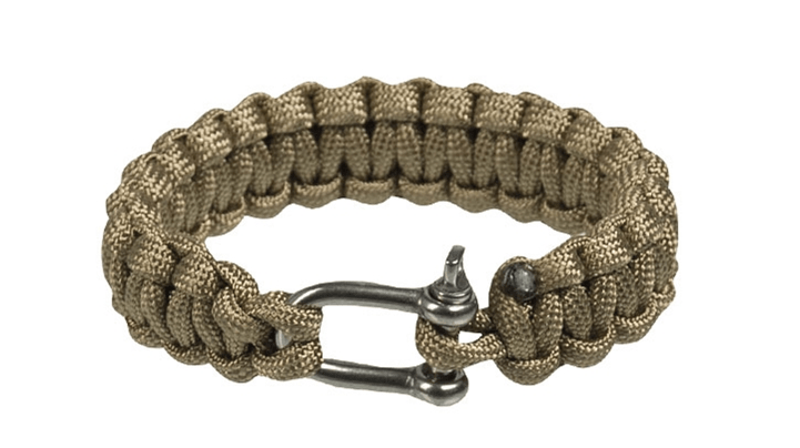 Braccialetto in paracord color coyote marrone con larghezza di 15 mm e chiusura in metallo, che può essere trasformato in una corda resistente allo strappo in situazioni di emergenza.