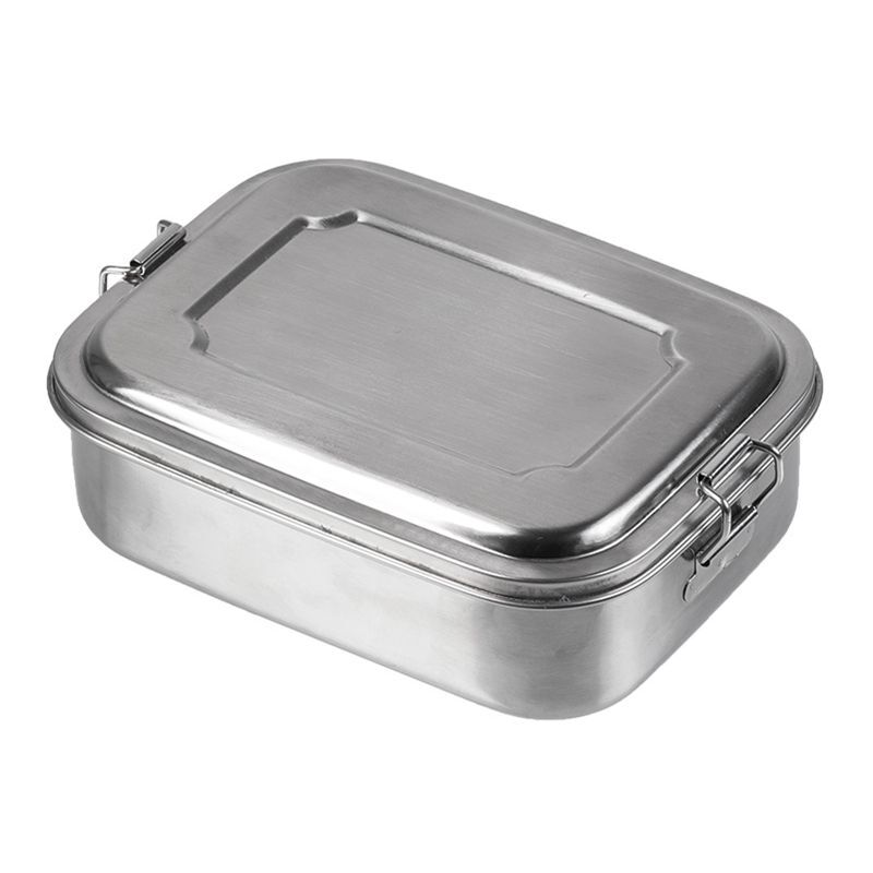Il robusto lunch box in acciaio inossidabile del marchio MIL-TEC è ideale per trasportare panini, frutta e verdura. La scatola si chiude con due clip. È lavabile in lavastoviglie.