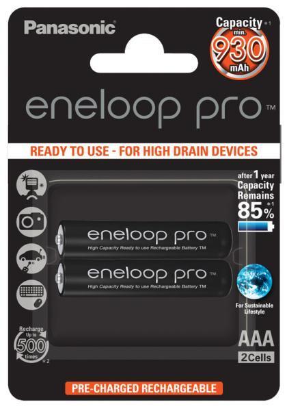 Le batterie ricaricabili AAA NiMH di alta qualità Panasonic Eneloop Pro con una capacità minima di 930 mAh (tipicamente 950 mAh). Gli accumulatori Eneloop Pro combinano i vantaggi di un'alta capacità con la tecnologia eneloop per una bassissima autoscarica.