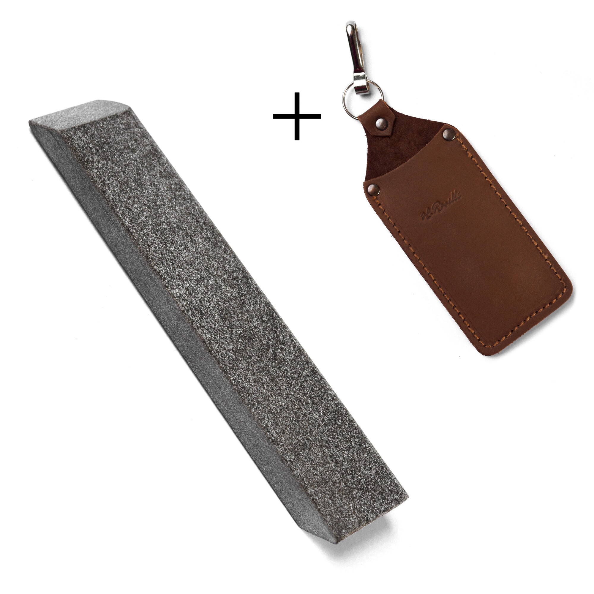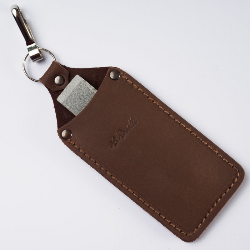 La pietra per affilare viene fornita con una custodia in pelle. La custodia è realizzata in pelle finlandese a Harmoinen, Finlandia. È dotata di un semplice anello metallico, che permette di appenderla a una catena o a un portachiavi.