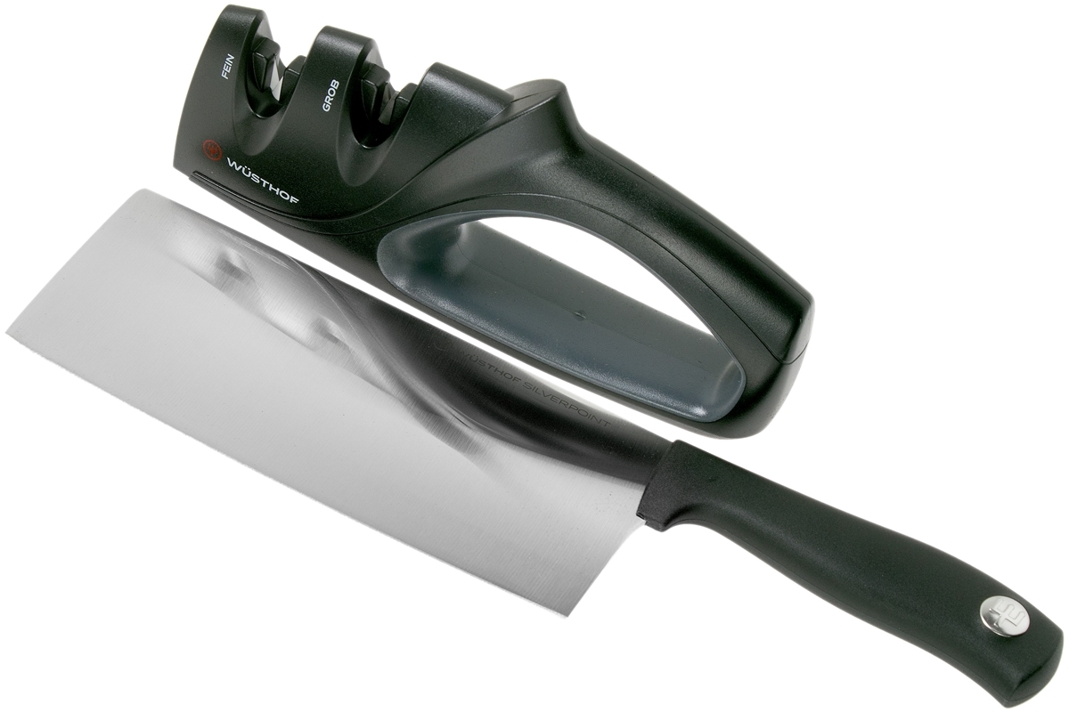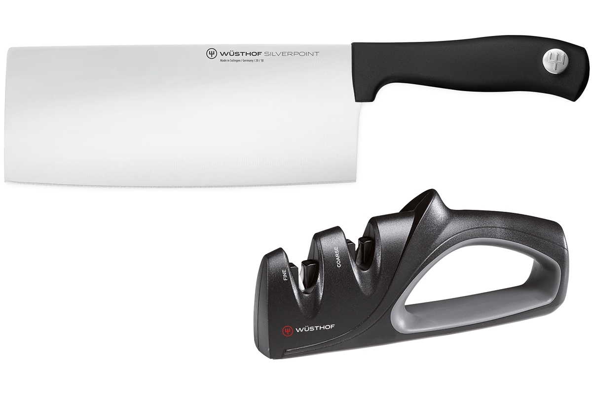 Set professionale a due pezzi SILVERPOINT composto da coltello da cucina cinese e affilatore della ditta WUSTHOF. La tipica lama extra larga è adatta per la preparazione di piatti non solo della cucina orientale. Dalla tagliatura degli ingredienti in fette sottili, al taglio di verdure e frutta in strisce sottili, fino a tritare erbe o carne per noodles.
