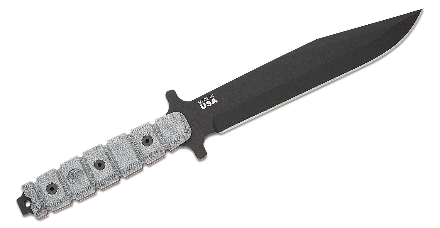 La lama con costruzione fulltang è realizzata in acciaio ad alto tenore di carbonio 1095. L'impugnatura sagomata in resistente micarta offre una presa solida anche in condizioni estreme.