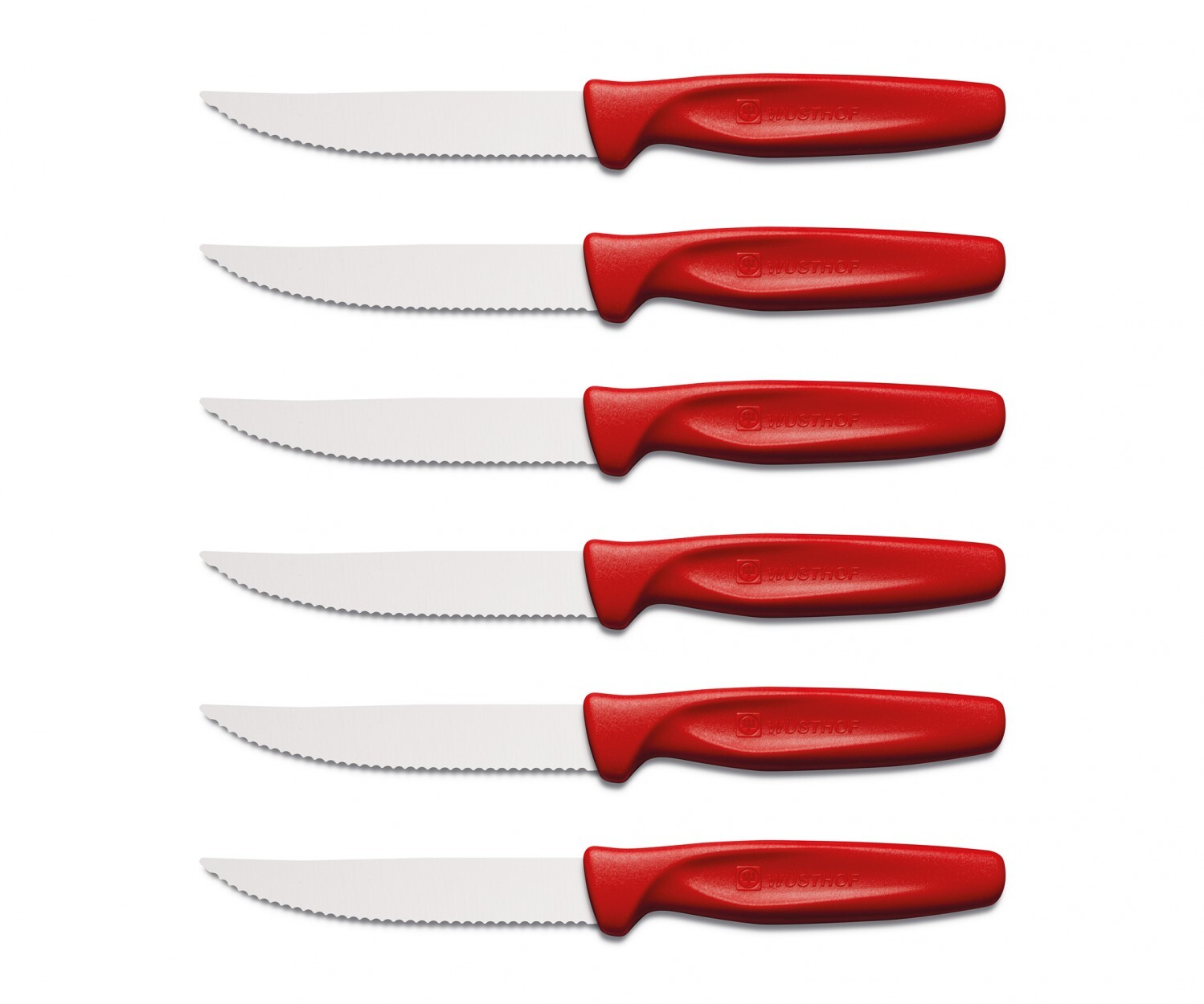 Set di 6 coltelli Wusthof per tagliare bistecche, pizza e per piccoli triti. Le lame sono in acciaio inossidabile con bordo seghettato, con una lunghezza di 10 cm. I manici sono in plastica rossa. Adatti per lavastoviglie.